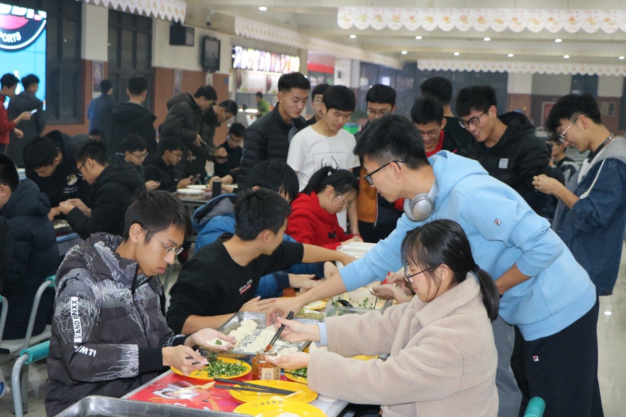 当天晚七时许,同学们来到海棠餐厅二楼,以班级为单位聚集在一起,准备开始包饺子。与此同时,食堂的叔叔阿姨们已经为同学们准备好了三种不同口味的馅料和一摞摞饺子皮,为活动的开展做好了充足的准备。