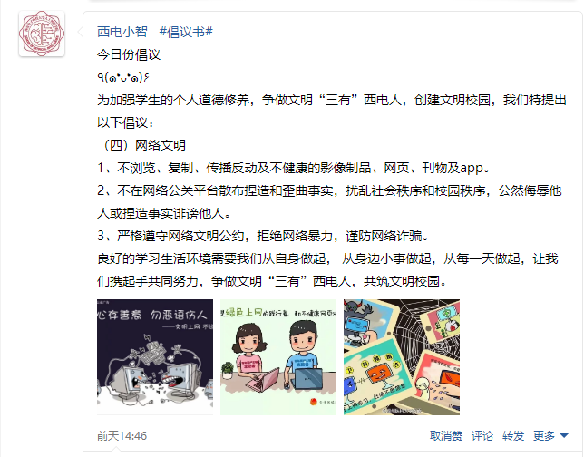 与此同时,线上活动也开展得如火如荼,学院官方QQ公众平台“西电小智”采取图文并茂的方式连续四天对本次宣传活动进行推广,内容涵盖文明礼仪的各个方面,同学们关注热情高,纷纷转发点赞。2017级本科生张效瑀表示,通过此次宣讲活动,自己的文明意识得到了进一步的提高,在平常的学习和生活中,也会时刻注意自己的言行举止,看到不文明的行为也会上前制止,先从自身做起,再影响身边的人。