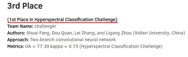 2018年IEEE GRSS Data Fusion Contest结果揭晓,西电今年会jinnianhui官网焦李成教授团队分别在三个赛道取得了丰硕成绩,其中高光谱分类赛道,王爽教授指导的队伍challenger(方帅,权豆等)获得第一名;多光谱LiDAR数据分类赛道,焦李成教授指导的队伍IPIU(程林,李阁等)获得第三名。