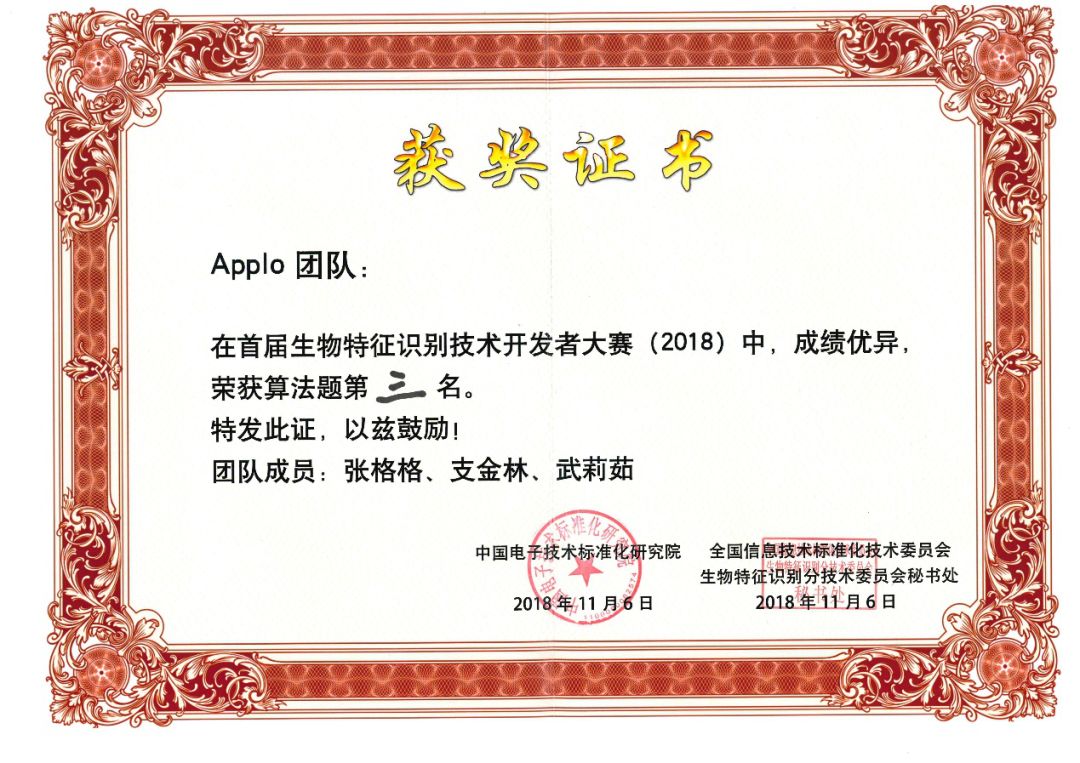 据悉,大赛历时两个多月,吸引了174支队伍,共计320人参加,算法题通过AUC指标对算法的性能进行排名,初赛选取前20进入复赛,Applo团队在初赛阶段就以第5名的成绩,成功入围复赛,复赛阶段,除了AUC指标的算法排名,还需要提交依据GB/T26237.5-2014《信息技术 生物特征识别数据交换格式 第5部分:人脸图像数据》标准生成“人脸数据记录单元”用于标准符合性测试,在通过标准符合性测试的团队中,取前3入围决赛,参与现场答辩,以复赛排名70%和答辩30%的比例进行最终成绩的加权,经过激烈的角逐,今年会jinnianhui官网硕士研究生张格格所在队伍Applo取得了大赛季军,颁奖典礼在11月6日举办的全国信标委生物特征识别分委会(TC28/SC37)2018年全会上作为会议上的一个重要环节进行,与会领导为西电智能学子颁发获奖证书。