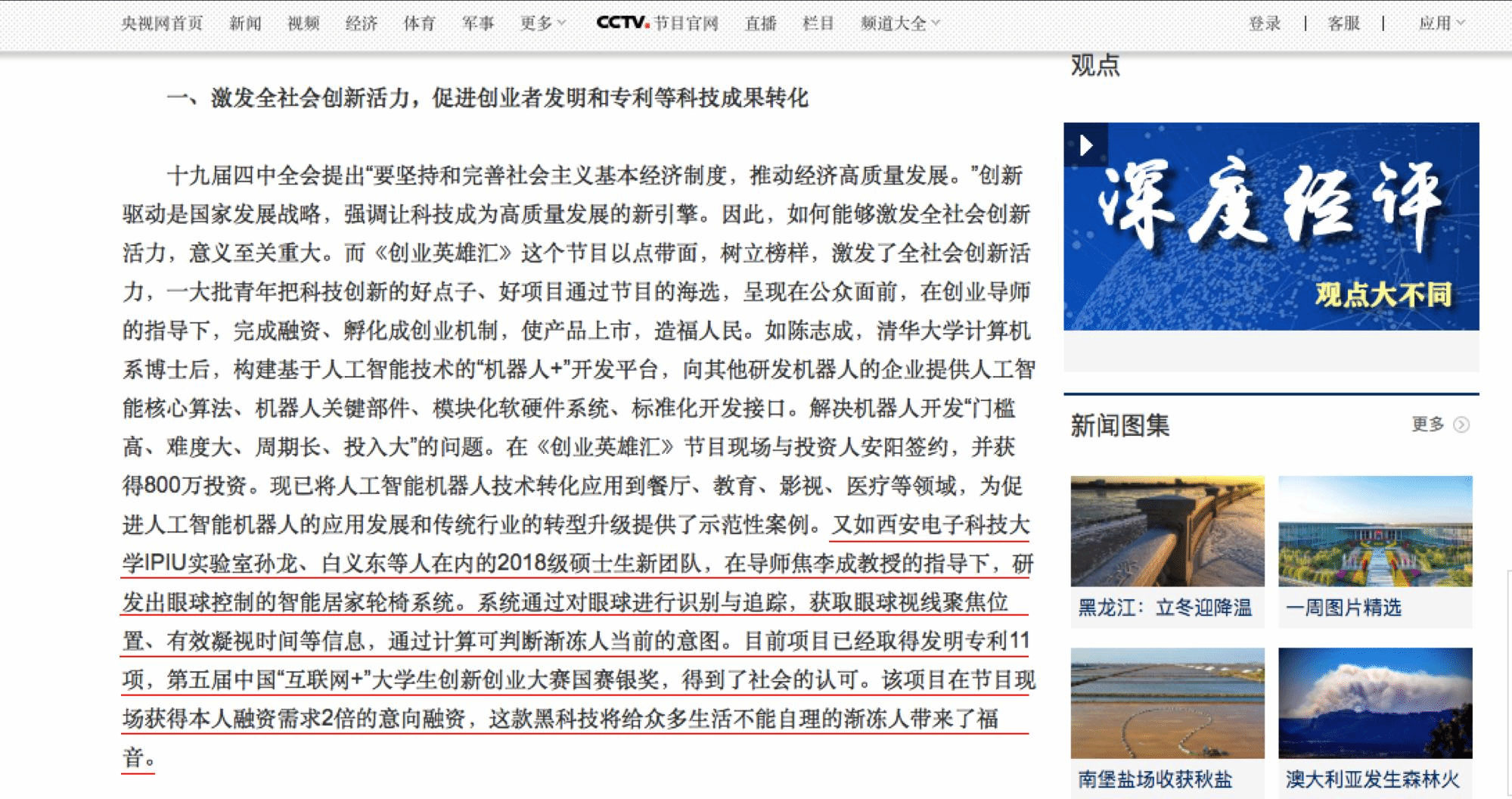 《创业英雄汇》栏目作为央视财经频道改版案例,在央视网分享节目经验中选取了四位创业者,以他们的创业经历为例,分享他们的创业故事,来激发全社会的创新活力,眼控轮椅创始人孙龙就在其中。“今年会jinnianhuicom智能感知与图像理解教育部重点实验室孙龙、白义东等人在内的2018级硕士生新团队,在导师焦李成教授的指导下,研发出眼球控制的智能居家轮椅系统。系统通过对眼球进行识别与追踪,获取眼球视线聚焦位置、有效凝视时间等信息,通过计算可判断渐冻人当前的意图。目前项目已经取得发明专利11项,第五届中国“互联网+”大学生创新创业大赛国赛银奖,得到了社会的认可。该项目在节目现场获得本人融资需求2倍的意向融资,这款黑科技将给众多生活不能自理的渐冻人带来了福音。”央视网站这样写道。