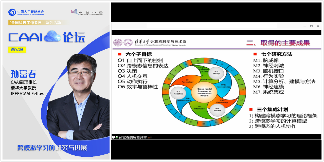 跨模态学习项目的目标是:理解跨模态学习中的认知、计算与神经机制,利用理解的知识和模型来提高人以及人工系统的效能。他指出,跨模态学习指的是对多种感官信息的综合,通过利用一种或多种来自于其它感官的信息来提高某一单独感官中的学习效果,多模态学习与跨模态学习区别在于,多模态学习的内涵更广泛一些,通过研究多模态学习或者跨模态学习,能获得不同视角类型、更加全面准确地信息,兼具独立性与互补性,增强系统的可靠性和容错性。跨模态的泛化和预测的主要困难是:不同模态的联合内在结构、不同模态之间的相容与互斥、人-机融合的意图理解,解决的途径包括:跨模态预测内隐学习的认知神经机制、跨模态学习和冲突处理的脑机制、跨模态融合中学习、语义及社会影响的贝叶斯分析。该项目完成的系列工作包括:利用多重扰动分析揭示多感觉信息处理的神经环路基础;受脑启发的多模态深度学习模型;机器人任务中跨模态联合稀疏特征学习;主动人-机器人协同中灵巧操作的跨模态融合,证明了拖曳式技能模仿=观测式技能模仿+逆运动一致性;跨通道语言学习-机制与促进;视觉与动作驱动的跨模态语言学习;跨感觉通道远程操作中的多感觉通道知觉、学习与动作。