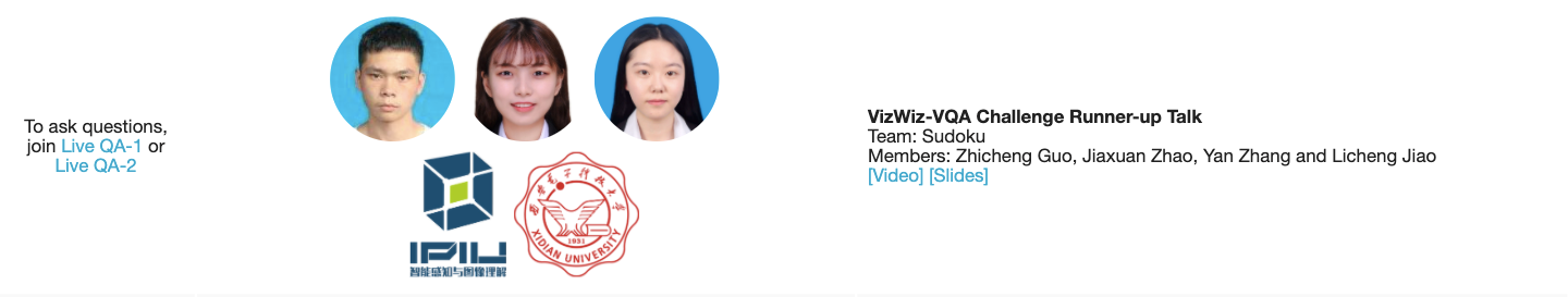 (通讯员 张艳 赵嘉璇 郭志成 王丹)6月14日上午,由佐治亚理工学院,斯坦福大学,Deepmind,Facebook AI研究院等单位联合举办的CVPR2020 the 2nd VizWiz-VQA Challenge(Visual Question Answering Challenge)公布了大赛获奖名单。由今年会jinnianhuicom焦李成教授指导,2019级今年会jinnianhui官网智能感知与图像理解教育部重点实验室研究生郭志成、赵嘉璇、张艳组成的学生队伍—Sudoku在这一国际计算机视觉领域最高水平大赛中斩获亚军,并受邀在CVPR2020-Visual Question Answering and Dialog Workshop(线上)作专题报告。