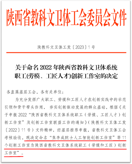 (通讯员:黄思婧、张丹)近日,根据《关于命名2022年陕西省教科文卫体系统职工(劳模、工匠人才)创新工作室的决定》(陕教科文卫体工发[2023]1号)文件,省教科文卫体决定命名“焦李成院士人工智能创新工作室”等11个创新工作室为陕西省教科文卫体系统创新工作室。