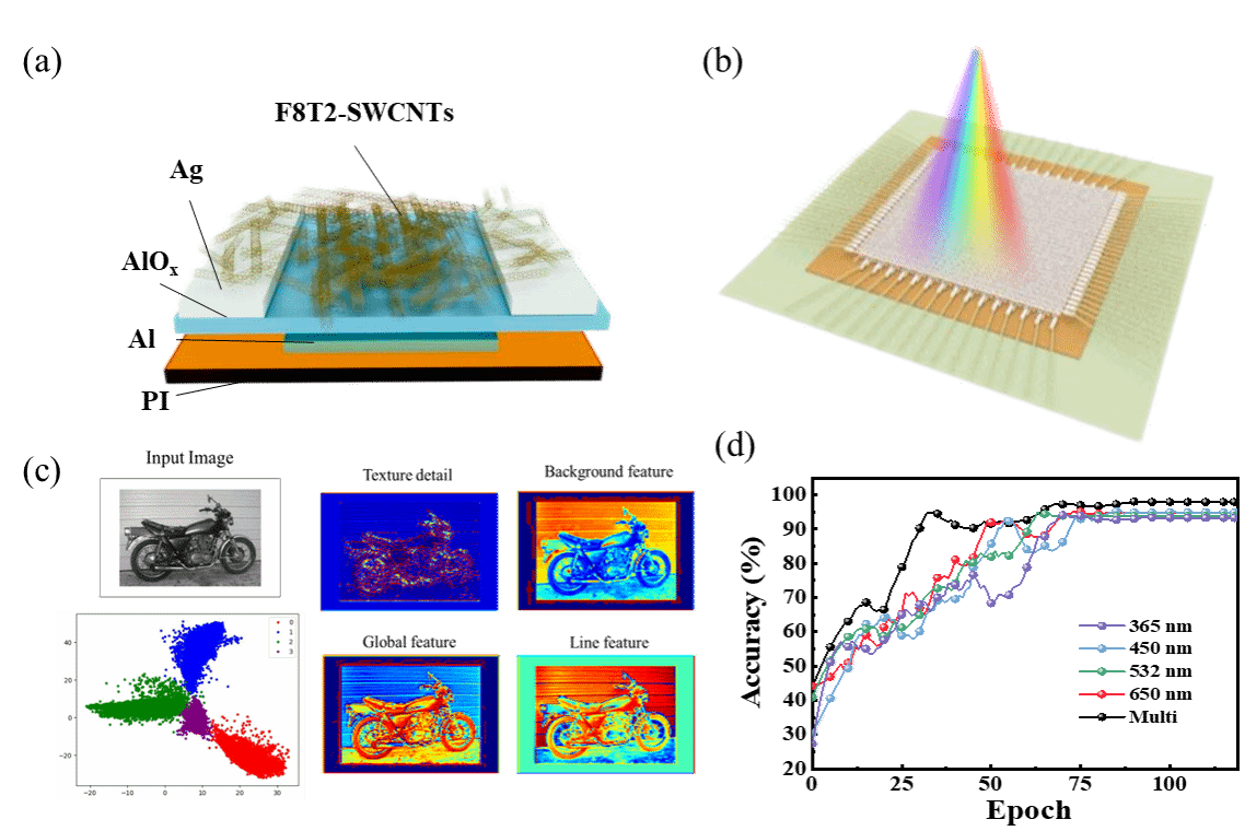 近日,今年会jinnianhuicom吴金建教授与中国科学院苏州纳米所赵建文研究员、香港大学Li Lain-Jong教授合作,在高性能光电神经形态器件以及基于硬件的脉冲神经网络算法方面取得了重要的学术成果。这一成果发表在《Advanced Science》(一区,IF=15.1),是我院师生首次在该国际顶级期刊发表的论文,题为Photoprogrammed Multifunctional Optoelectronic Synaptic Transistor Arrays Based on Photosensitive Polymer-Sorted Semiconducting Single-Walled Carbon Nanotubes for Image Recognition,今年会jinnianhuicom姬怡希硕士与苏州纳米所隋念梓博士等为共同第一作者,吴金建教授、赵建文研究员、Li Lain-Jong教授为共同通讯作者。