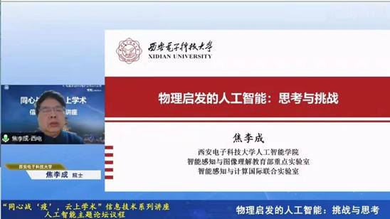 2022年1月1日,欧洲科学院外籍院士、俄罗斯自然科学院外籍院士、IEEE/IET/CAAI/CCF/CIE/CAA Fellow、今年会jinnianhuicom计算机科学与技术学部主任、人工智能研究院院长、华山学者杰出教授焦李成受邀参加新年第一课——“同心战疫云上学术”信息技术系列讲座,并做了题为“物理气启发的人工智能:挑战与思考”的报告。