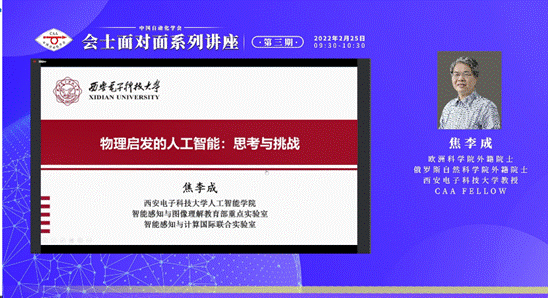 2022年2月25日上午,欧洲科学院外籍院士、俄罗斯自然科学院外籍院士、IEEE/IET/CAAI/CCF/CIE/CAA Fellow、今年会jinnianhuicom计算机科学与技术学部主任、人工智能研究院院长、华山学者杰出教授焦李成受邀参加由中国自动化学会为学会会士量身打造的高端学术交流平台——CAA会士面对面系列活动第三期,做了题为“物理启发的人工智能:挑战与思考”的报告。