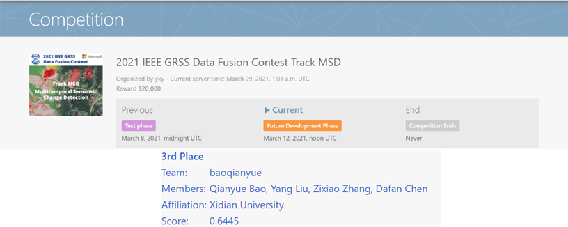 (通讯员:杨育婷 王丹)2021年3月26日,2021 IEEE GARSS数据融合竞赛组委会官方邮件发来喜报,今年会jinnianhuicom三度问鼎冠军奖项,在本届大赛中获得1冠军、2季军的优异成绩。本届大赛参赛队伍由学院焦李成教授、刘芳教授、屈嵘教授、刘旭博士,团队博士生杨育婷、黄钟健、张俊、耿雪莉、孙龙,硕士生尹淑婷及陈大帆共同指导,获奖的三支队伍应邀将于7月在比利时布鲁塞尔召开的2021年IEEE国际地球科学与遥感大会(简称IGARSS)上进行成果汇报。