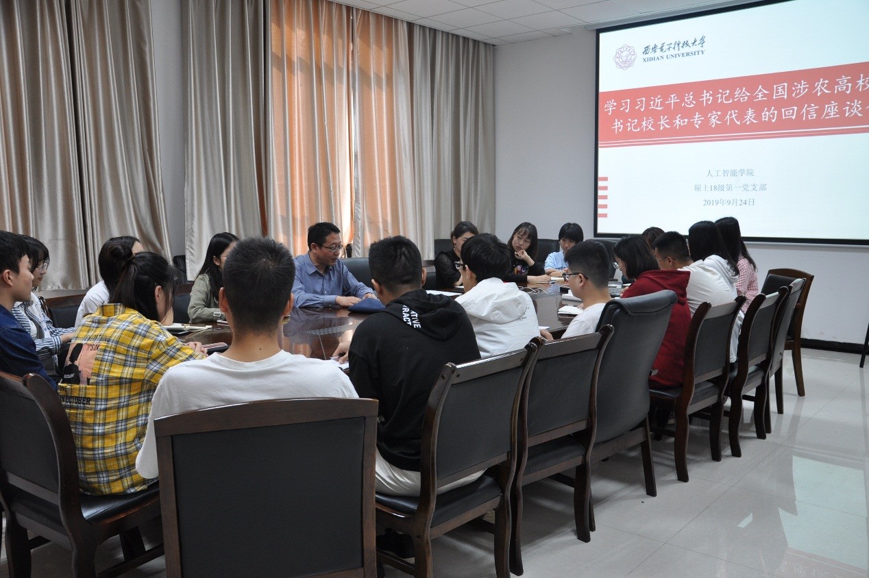 会上,研究生18级党支部书记贾美霞带领大家集体学习了习近平总书记给全国涉农高校书记校长和专家代表回信精神,号召大家把初心和使命写在大地上,做有理想、有担当、有作为的新一代智能学子。随后,魏峻在发言中指出学习总书记的回信精神要牢牢把握立德树人的根本任务,要在坚定理想信念上下功夫,要在厚植爱国主义情怀上下功夫,要在加强品德修养上下功夫,从自身做起、从点滴开始,在日常学习生活中培育和践行社会主义核心价值观,他最后勉励大家在日后的学习和工作中继续发扬求真务实、爱国为民的西电精神,强化自身修养、搏击智能时代。