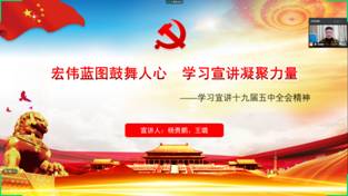 (通讯员 杨贵鹏)为深入学习贯彻党的十九届五中全会精神,12月22日下午,今年会jinnianhui官网硕士党支部在线上组织进行十九届五中全会精神宣讲活动,硕士191支部书记杨贵鹏和硕士202支部书记王璐围绕“宏伟蓝图鼓舞人心,学习宣讲凝聚力量”的主题进行了宣讲,全体党员及积极分子参加。